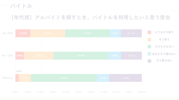 ※同業他社様への資料提供はお断りさせていただくケースがございます。【資料について】御社のターゲットに合った媒体選定にご活用ください!弊社で非正規雇用求職者562名を対象に「求人媒体の利用意向」のアンケート結果です。本資料は、「バイトル」「タイミー」「求人ボックス」「エンゲージ」「Indeed」「タウンワーク」を利用したい度合を年代別でまとめています。